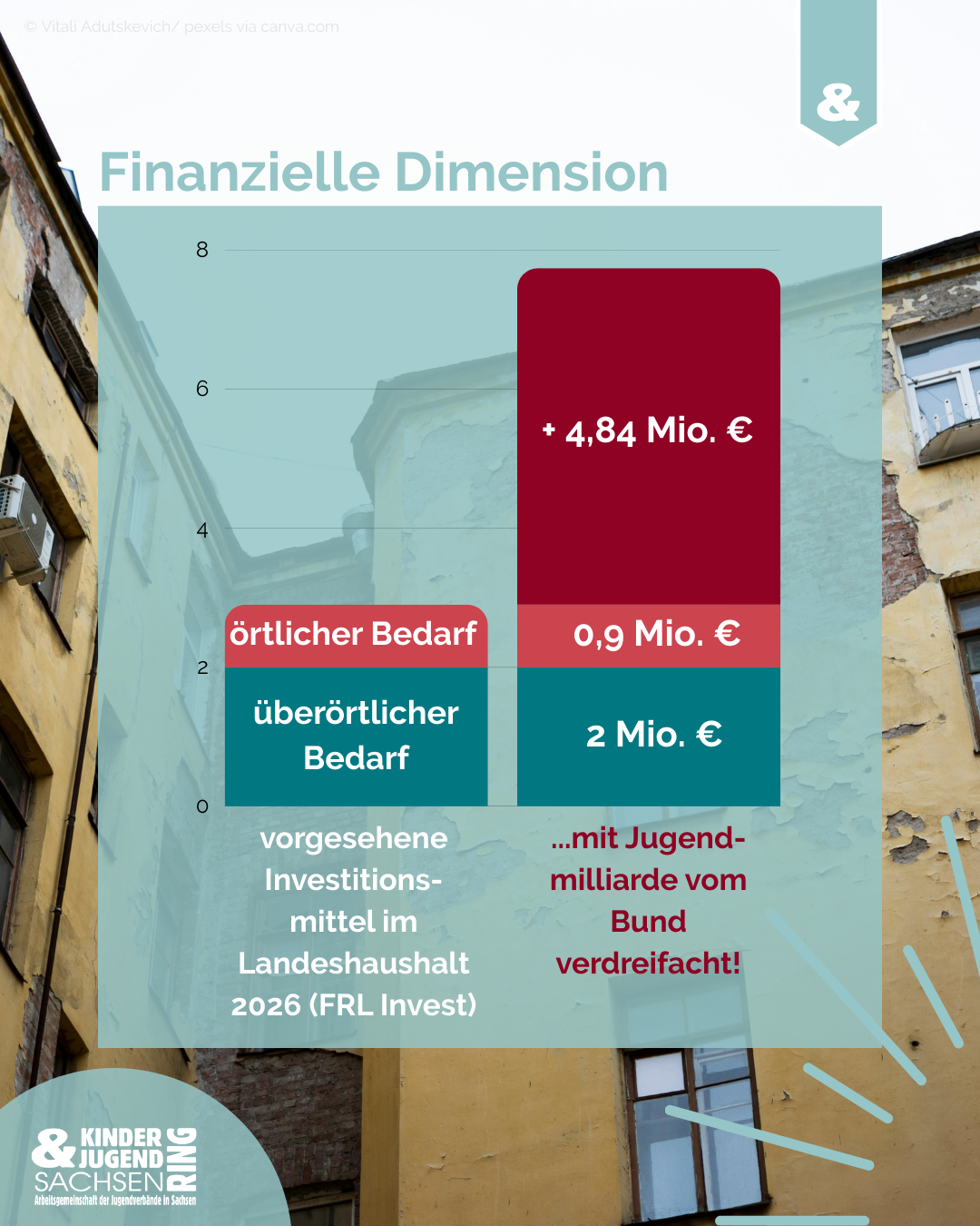 Eine Jugendmilliarde bedeutet für Sachsen 4,838 Mio. € zusätzliche Investitionsmittel. Der Landeshaushalt 2026 sieht aktuell lediglich 2,9 Mio. € für jugendpolitische Investitionen vor. Mit der Jugendmilliarde und den vorhandenen Mitteln könnten die Investitionsmöglichkeiten mehr als verdreifacht werden.